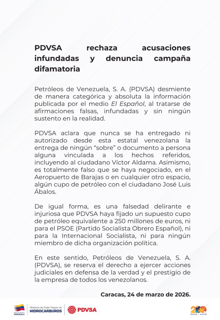 PDVSA rechaza acusaciones infundadas y denuncia campaña difamatoriaPDVSA rechaza acusaciones infundadas y denuncia campaña difamatoria